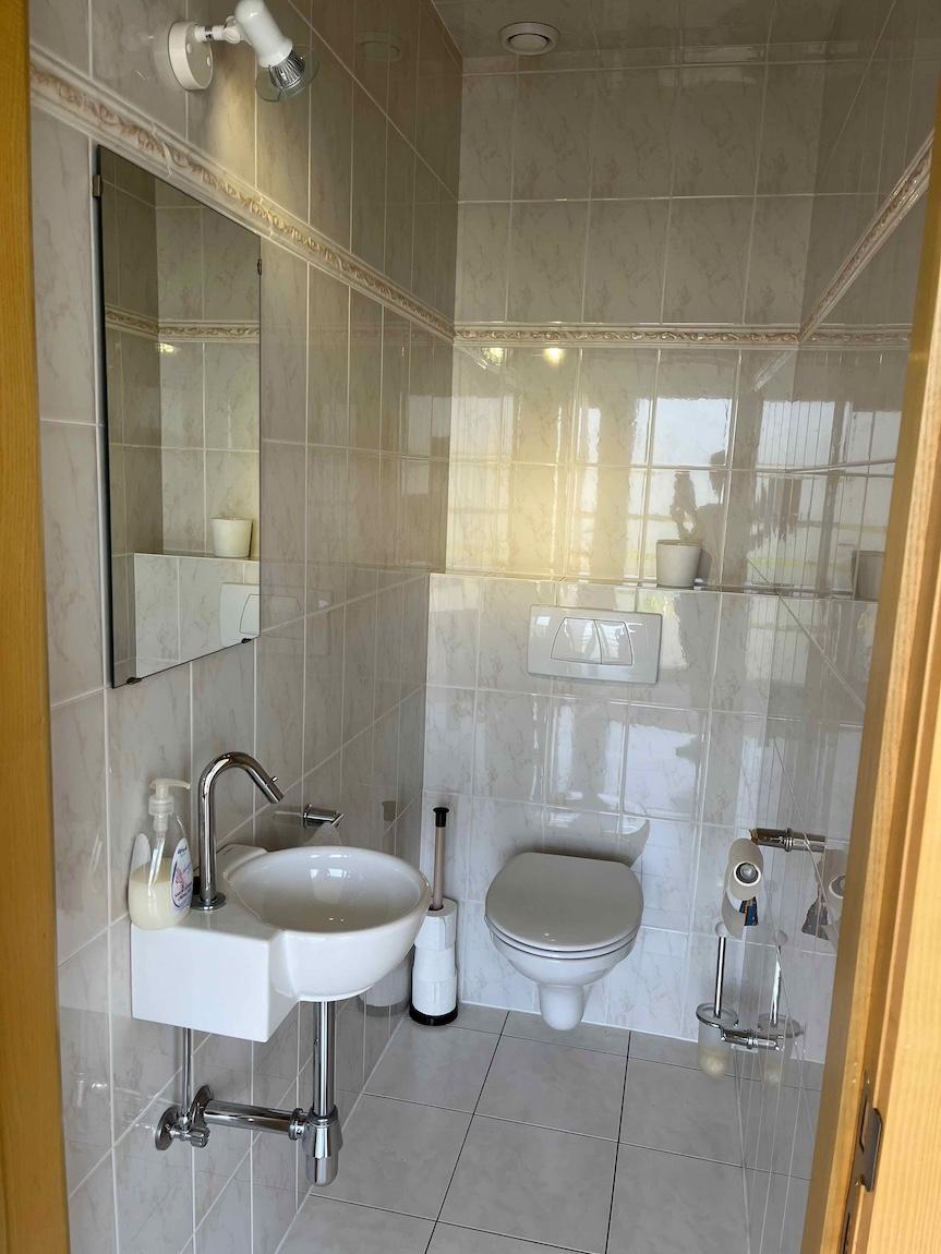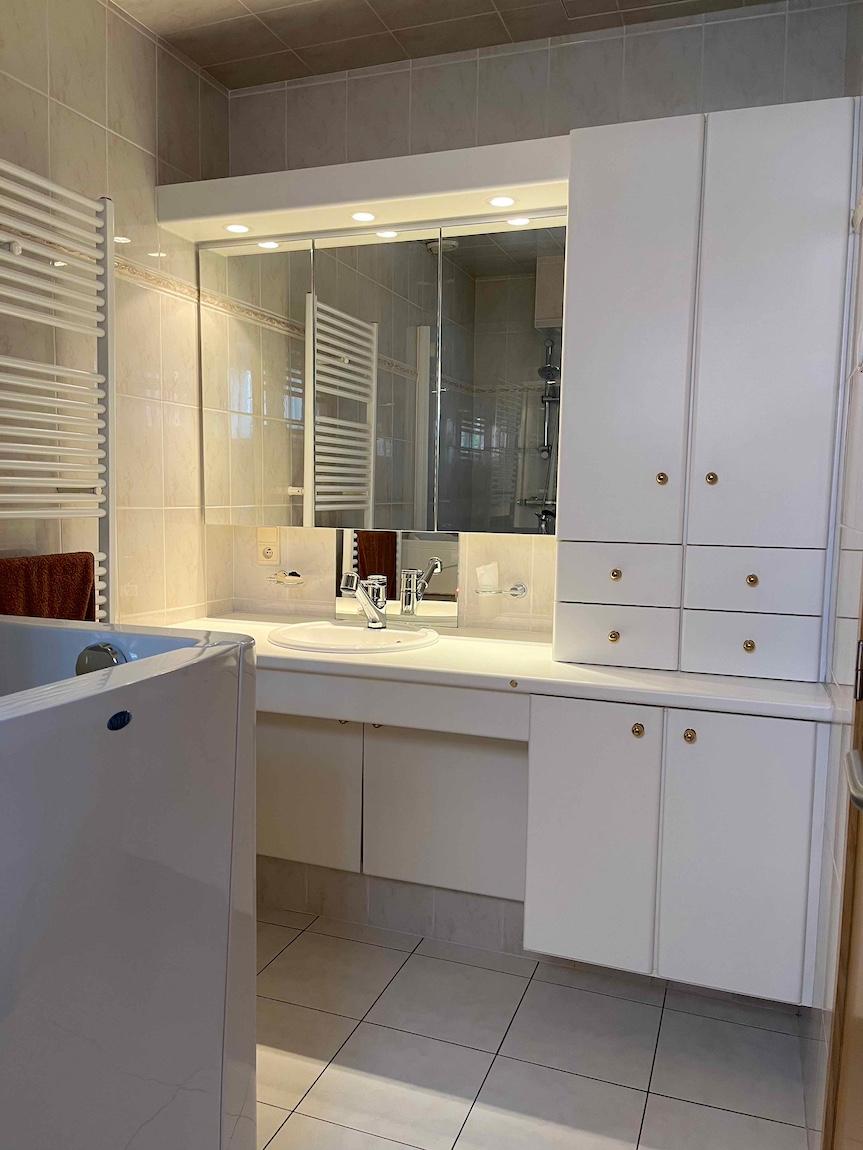 Bij het binnenkomen valt meteen de royale inkomhal op, voorzien van gastentoilet en aparte toegangsdeuren naar de hoofdwoning en kangoeroewoning / home office.