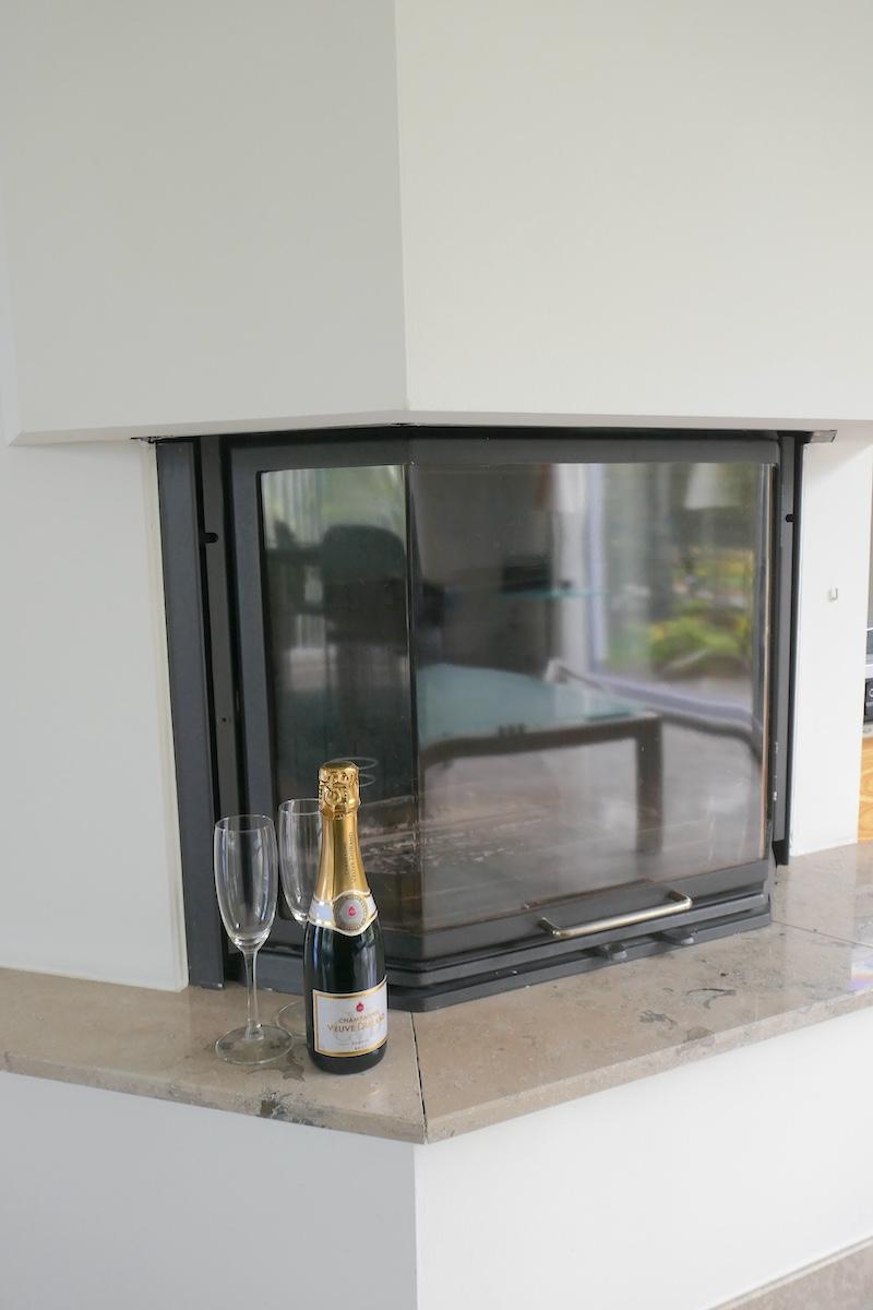 -een lichtrijke woonkamer met gezellige haard, en met toegang tot het terras en de tuin